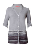 V-neck tunic style shirt with three quarter sleeves & woollen patchwork embroidered detail at the bottom